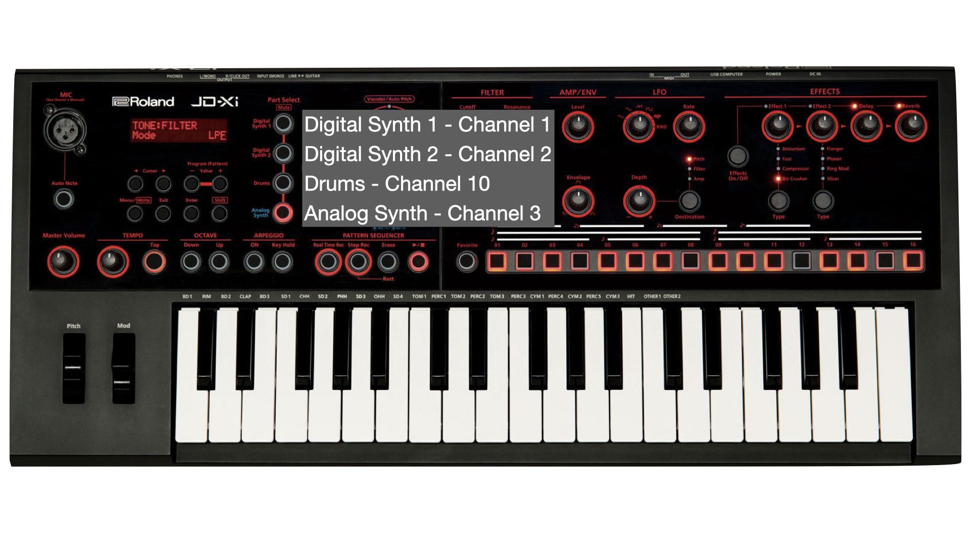 The organ I have is a Yamaha Electone ME-55a, but many others will work, as will other synthesisers, almost certainly the JD-Xa, but others with multiple synthesiser channels may work with this same trick.
